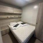 • Spalnica z zakonsko posteljo (160×200), nočno omarico, veliko omaro za oblačila ter shranjevalne oomarice nad posteljo